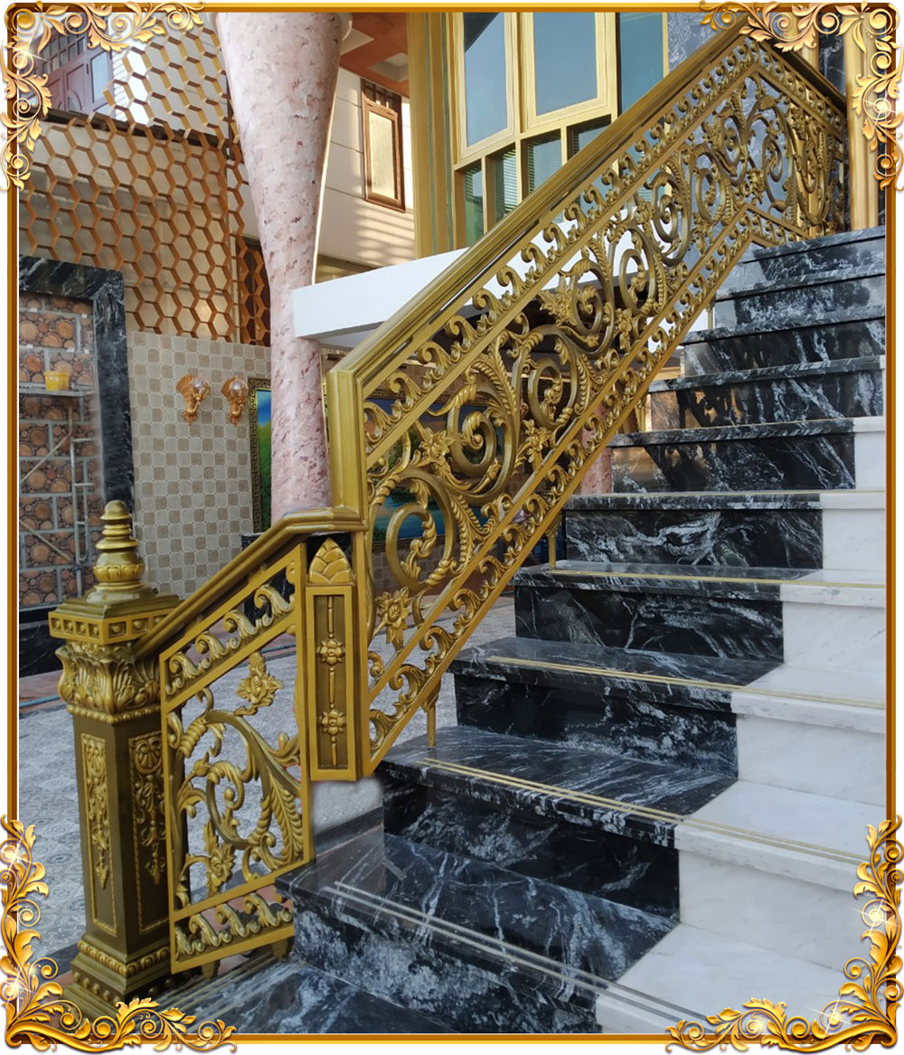 Cầu thang nhôm đúc hoa lá tây mạ vàng cổ điển